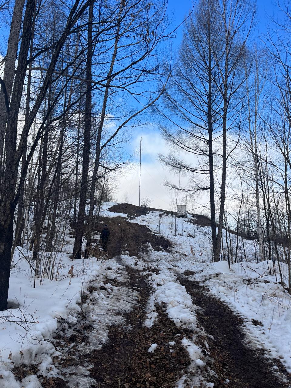 В феврале 2024 года приступили к реализации. Спроектировали и согласовали легкую мачту, очень оперативно ее изготовили, закупили все необходимое оборудование и выдвинулись на место. Место это, труднодоступное, дорог туда нет, движения никакого нет, вокруг снежная целина пробраться через которую на нашем УРАЛе и двухкабинном «пожарнике» уже само по себе путешествие. Кроме глубокого снега и ручьев, дорогу преграждают поваленные деревья и непроходимая тайга. Свернув рано утром с трассы в заповедник, только к вечеру удалось «пропилиться» сквозь тайгу и «пробиться» сквозь снега к месту проведения работ.